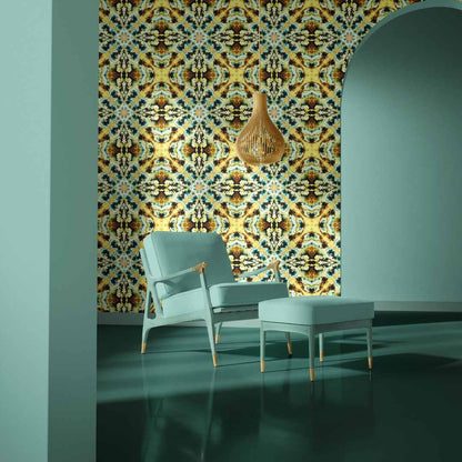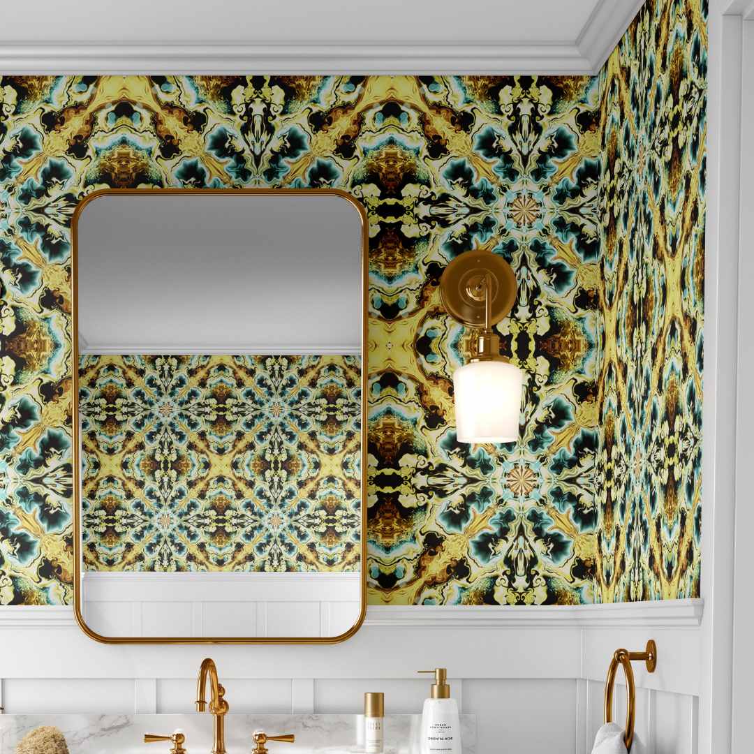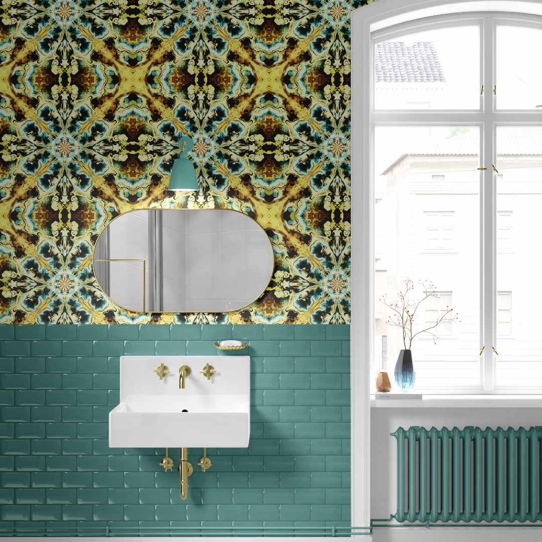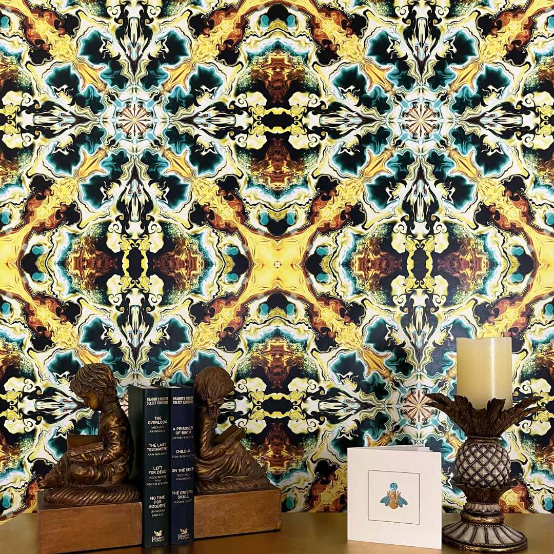 Introducing our Molten Mosaic Wallpaper by Liberty James Studio, an immersive masterpiece that brings a burst of energy and vitality to any space. This captivating design features a stunning array of fluid, vibrant colours in exquisite shades of teal, yellow, and bronze, creating a mesmerizing kaleidoscope of hues.