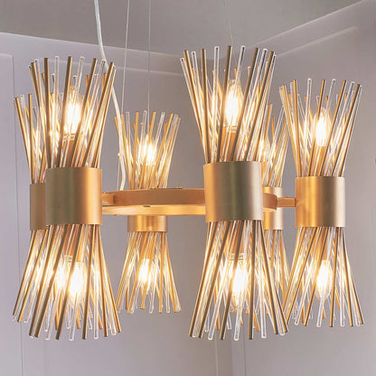 Supported by a brushed antique brass fitting, the Moray Chandelier boasts six stunning shades. Designed around a circular base with shades made of clear glass and brushed brass rods. This modern chandelier cast both up and down lighting for a truly elegant effect.