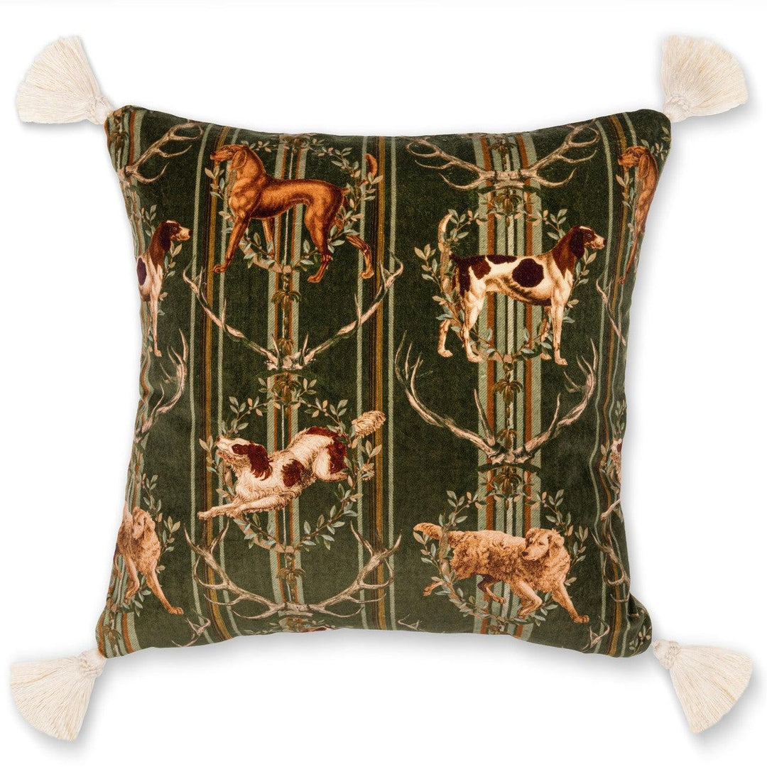 Finished with four silky cotton tassels, this plush piece will be sure to bring some dogged charm to your bedroom or living room set. Whether you're nestling into a sofa or reclining on a bed, wrap yourself in luxury with the Mountain Dogs Cushion and let adventure come to you.