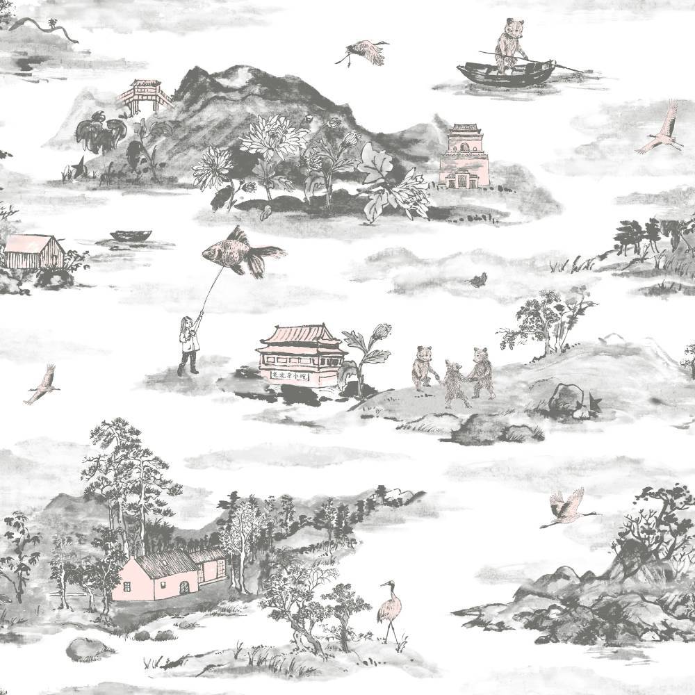 Chinese painting and European illustration combines to create a spectacular backdrop of misty mountains and time-honoured Chinese houses. This beautiful hand painted landscape is home to a family of bears looking for adventure.