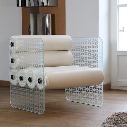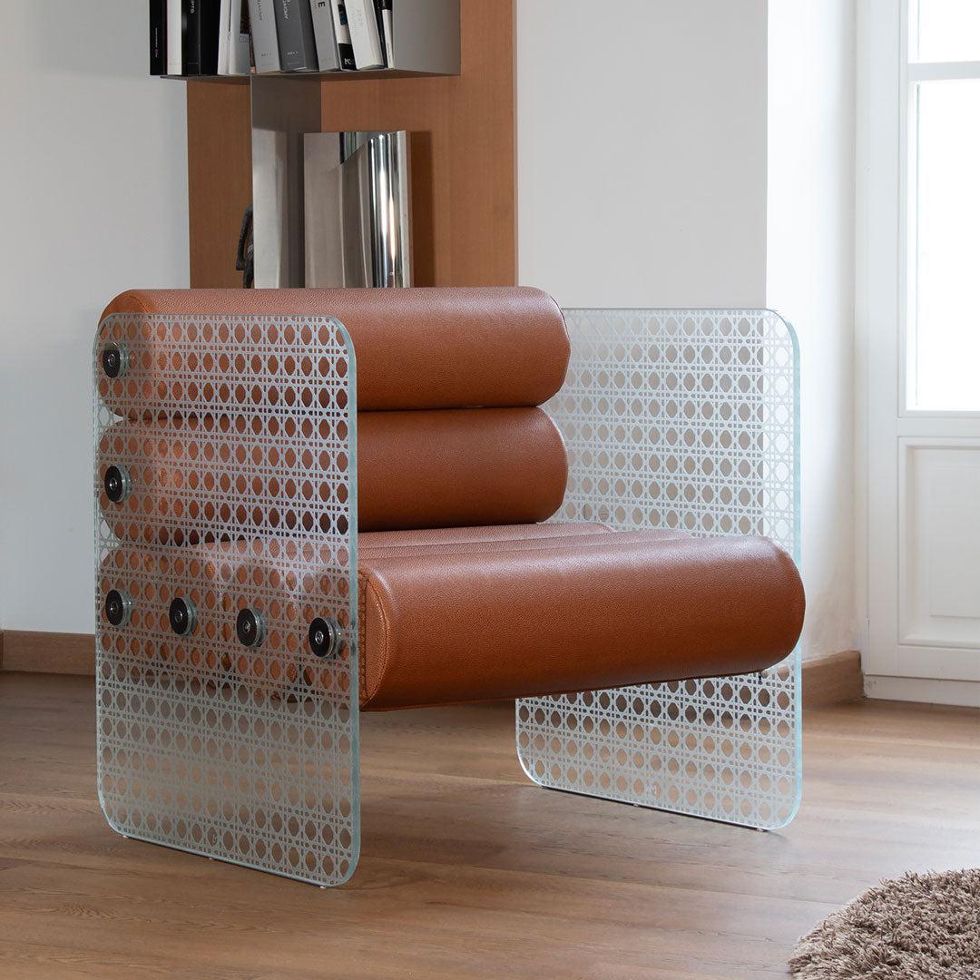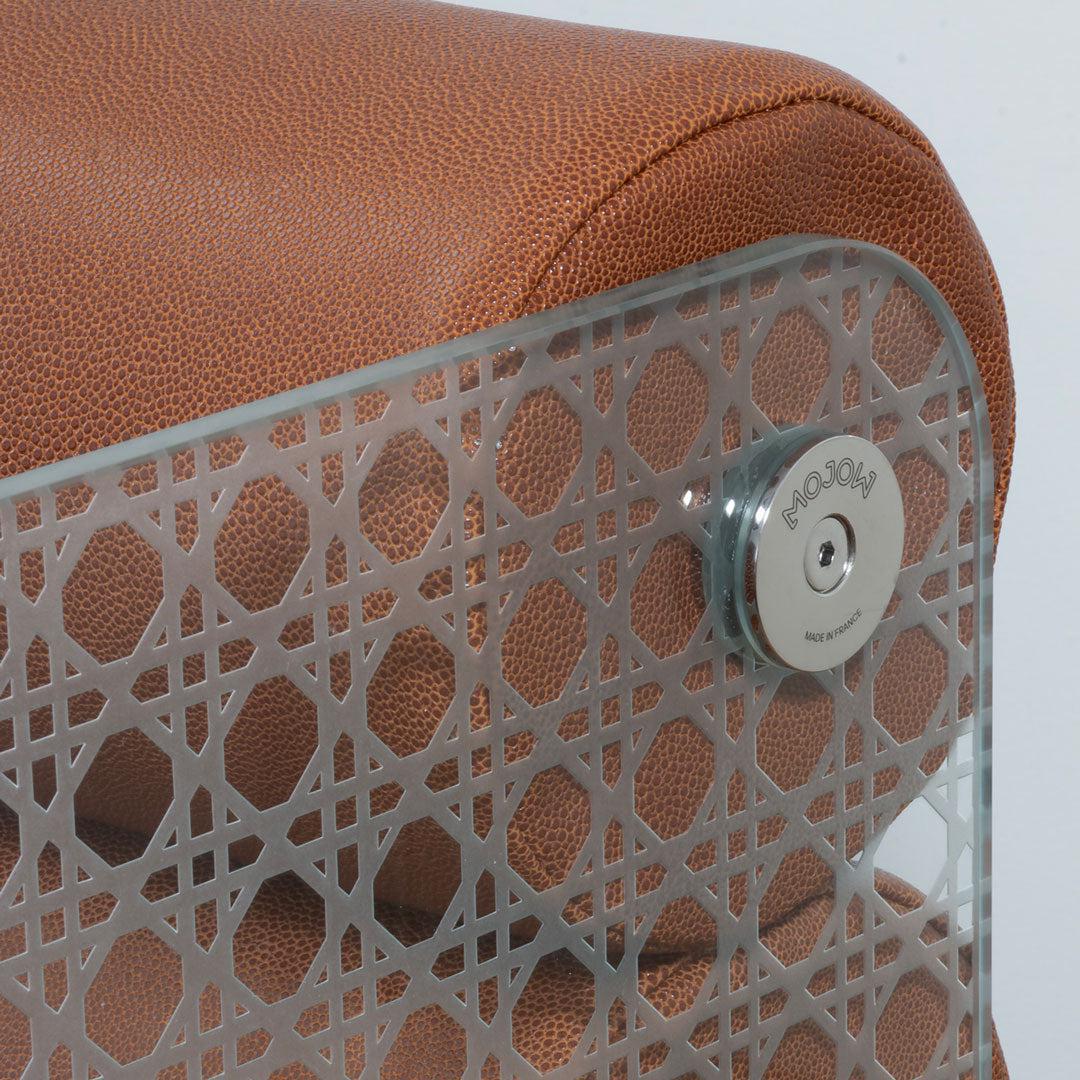 The Cannage chair is the epitome of balance and harmony, brought to life through its sleek, yet timeless design. The intricately engraved and sandblasted cannage pattern is a true work of art, adding a touch of opulence to your home. The combination of glass panels and a vegan leather seat exudes an air of luxuriousness, making it the perfect addition to any contemporary living room.