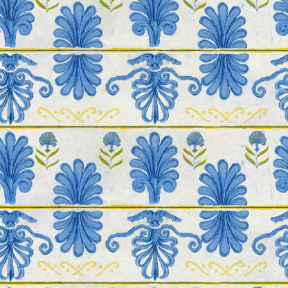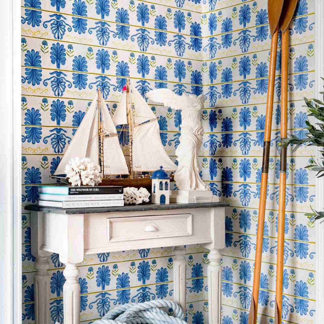 The chic Mediterranean style Mykonos Villa Motif Wallpaper by Romanian designer MINDTHEGAP is sure to bring a cool coastal vibe to your home.