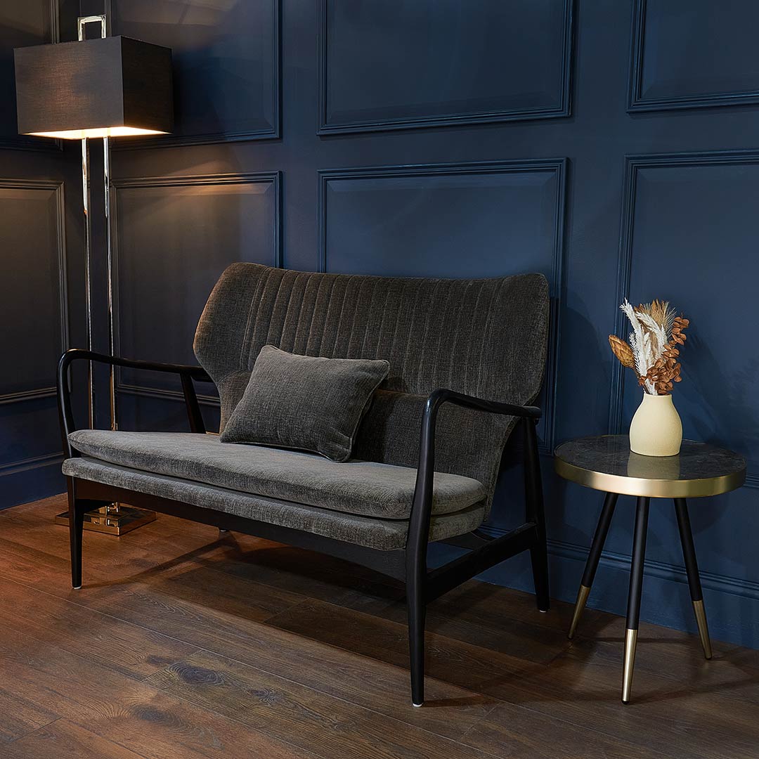 The Oakham 2 Seater Sofa from RV Astley is an ideal addition to any home! With a sleek, black wooden frame that extends and curves into fluid shapes, you'll love the classic style this piece brings to your décor.