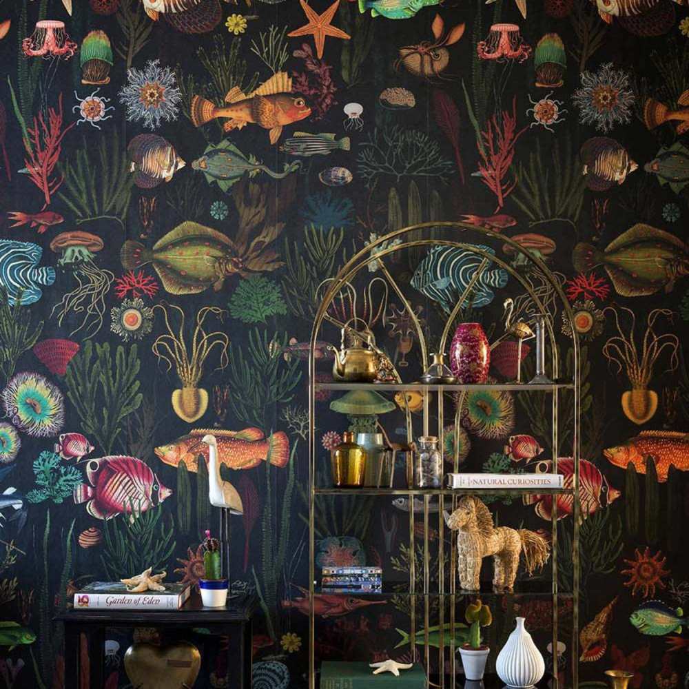 Inspired by the fascinating depths of the ocean, the vibrant Oceania Wallpaper unveils a stunning design on a black background, rich in details and colours.