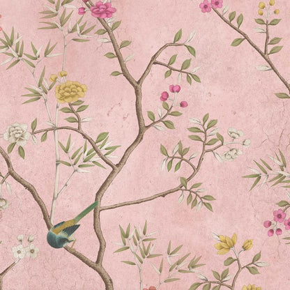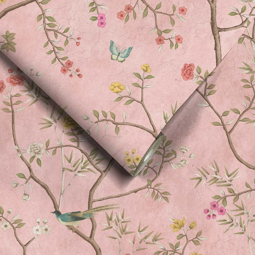 Step into a fairytale dreamland with the exquisite Onism Wallpaper in Dusty Pink. Daringly different and undeniably elegant, this wallpaper is a vintage lover's dream come true. With its unmistakable Chinoiserie and Oriental influences, the design features delicate exotic birds whispering secrets to each other amidst a stunning backdrop of lush trees, fluttering butterflies and blooming flowers.