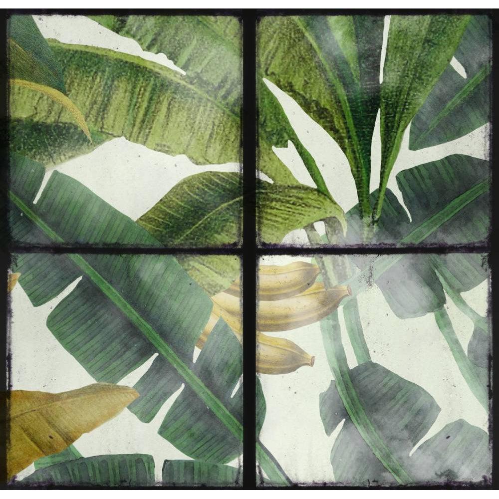 Tropical fruits in soft colors add texture and depth to the abundant setting of big and luscious green leaves. Framed behind an apparent delicate window, the design is printed over 3 rolls, expanding the green vision of this heavenly nature’s corner. Bananas, pineapples, lemons and oranges peek from behind gigantic tropical leaves, defining the well kept orangeries of fashionable residences from the 17th to the 19th centuries.