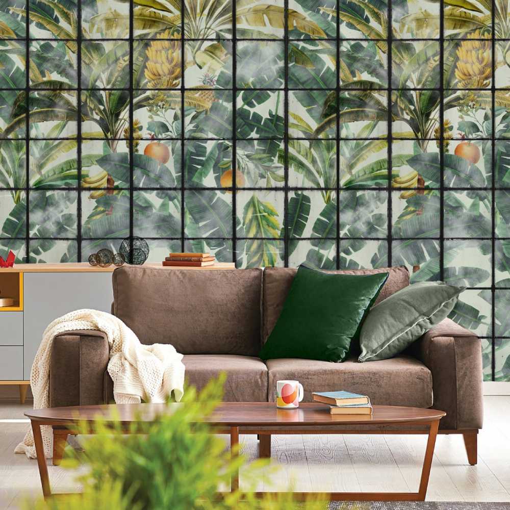 With a luxurious design of an exotic indoor garden, the stunning Orangerie Wallpaper by MINDTHEGAP gives the feeling of an elegant fashionable residence behind a vintage glass wall.