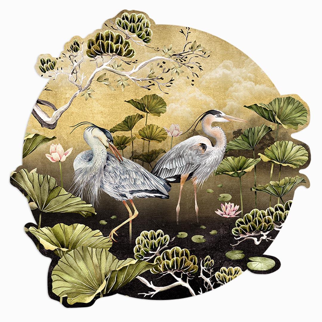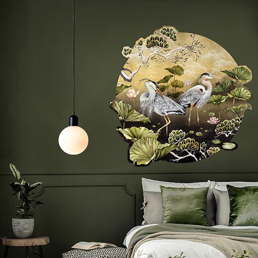 Introducing the Golden Orient Wall Decal, a stylish and sophisticated way to decorate any room in your home. This decal features two graceful blue herons wading through a tranquil lily pond, surrounded by golden light. It's the perfect way to add a touch of elegance to any space.