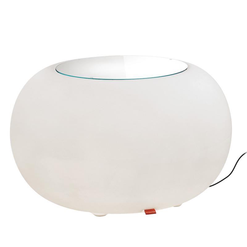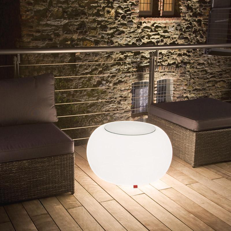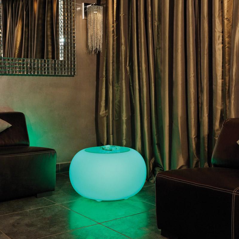 The LED Bubble is inspired by a pouf, the designer wanted to use the concept of a traditional cushion and turn it into a modern, multifunctional illuminated piece of furniture. The result is a sturdy Bubble made from high-quality translucent plastic. The top has a circular indent so you can choose from a glass top to make a side table or a colourful cushion to transform into an outdoor stool (available in 5 colours; red, orange, purple, green and grey).