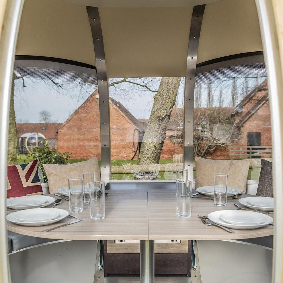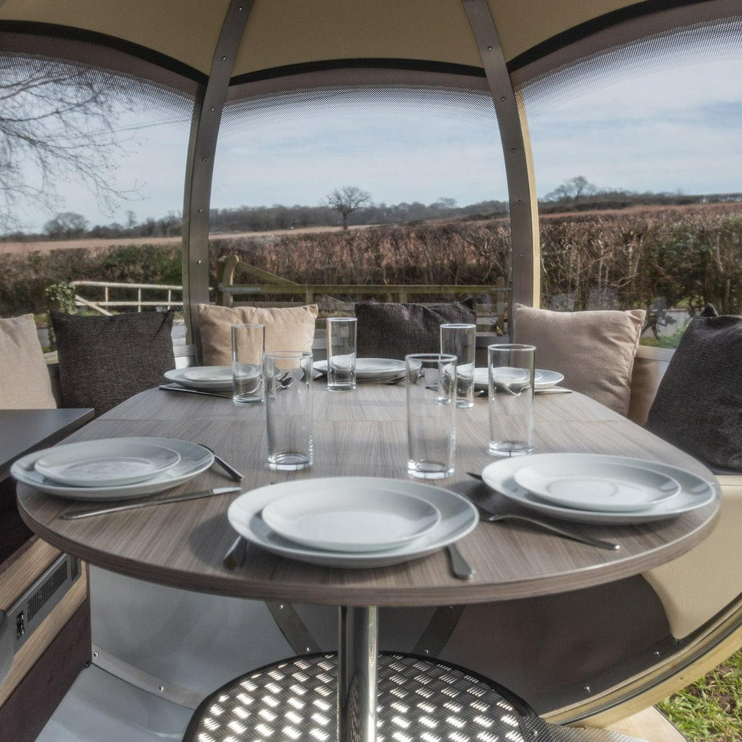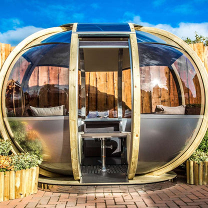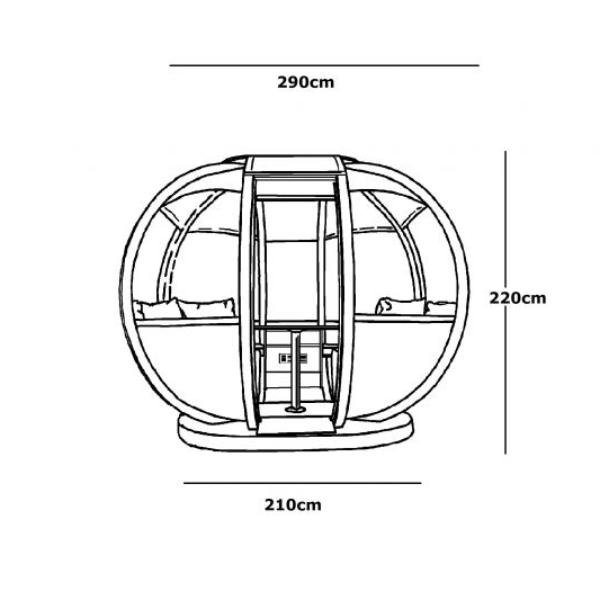 The Oval House Small Garden Pod has comfortable edge seating with a centre table. The table is adjustable so it can be folded from a larger dining table to a smaller coffee table. Ambient lighting creates a unique mood and atmosphere in the interior with embedded ceiling LED lights.