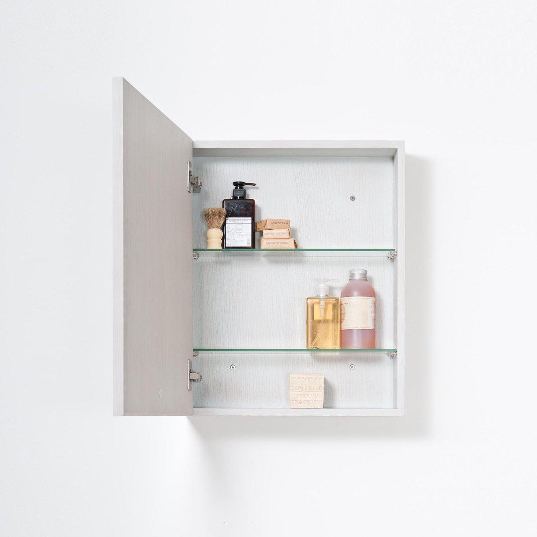 Sleek and stylish, the design of the cabinet takes a minimalist approach, further enhanced by its super slim oak profile with mirror edge. The interior of the 550 reveals two polished glass shelves. The cabinet can be mounted for either left or right hand door opening, houses two adjustable emerald edged glass shelves and the door hinges soft close.