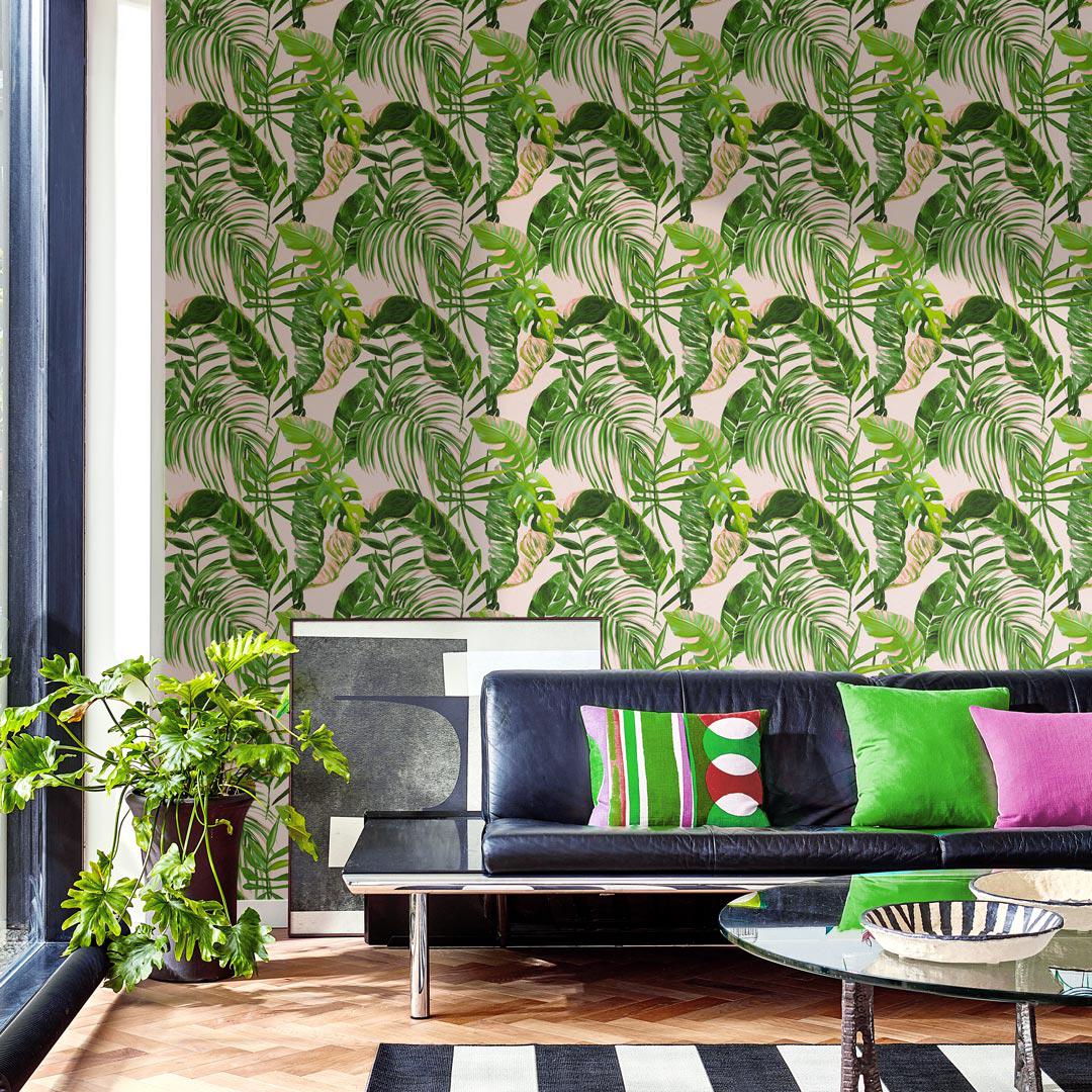 Vibrant and bold, the vivacious Palmera Wallpaper by Ohpopsi features an abundance of trailing palm leaves. The painterly effect generates positive energy and movement across the design.