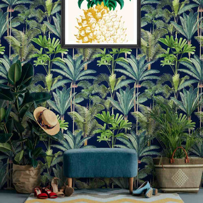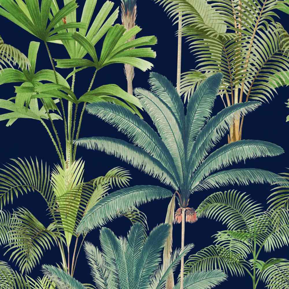 An exotic design, on a dramatic black background, Palmeras Anthracite Wallpaper depicts impressive palm trees in hues of blue and green, is sure to create a vibrant tropical atmosphere in any room of the home.
