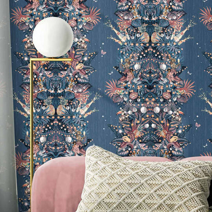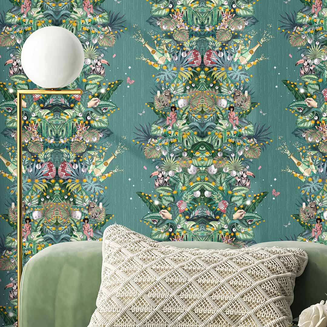 Step into the lush, surreal world of Paradise Party wallpaper, a vibrant fusion of tropical luxury and nightlife fantasy. Part of the eclectic Groove Inferno Collection, this bold wall mural transforms any space into a maximalist jungle filled with imagination, glamour, and unexpected delights.
