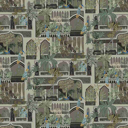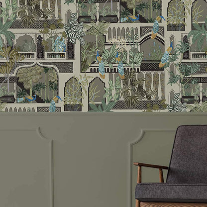 Designed by the super talented Josephine Munsey, this striking wallpaper design was inspired by Indian architecture. It is brought to life with lush foliage and playful peacocks. This pattern has traditional geometric pattern set in architectural doorways and windows. All meticulously hand painted.