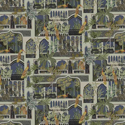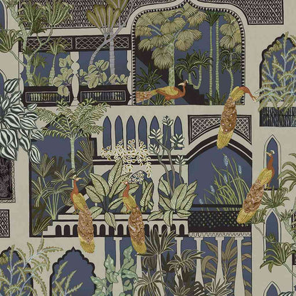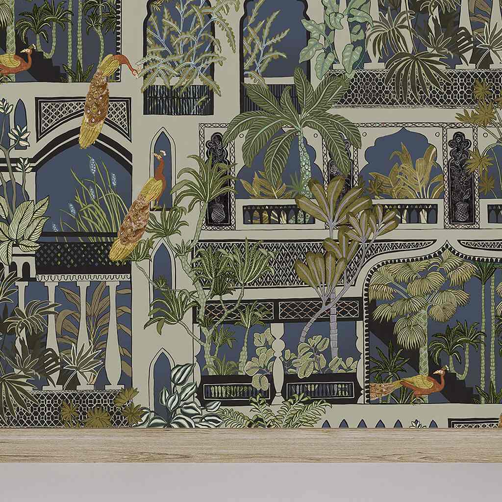 This striking tropical wallpaper design was inspired by Indian architecture. Brought to life with lush foliage and playful peacocks, the rich green ferns stand out beautifully from the rich petrol blue accents. This pattern has traditional geometric pattern set in architectural doorways and windows. All meticulously hand painted.