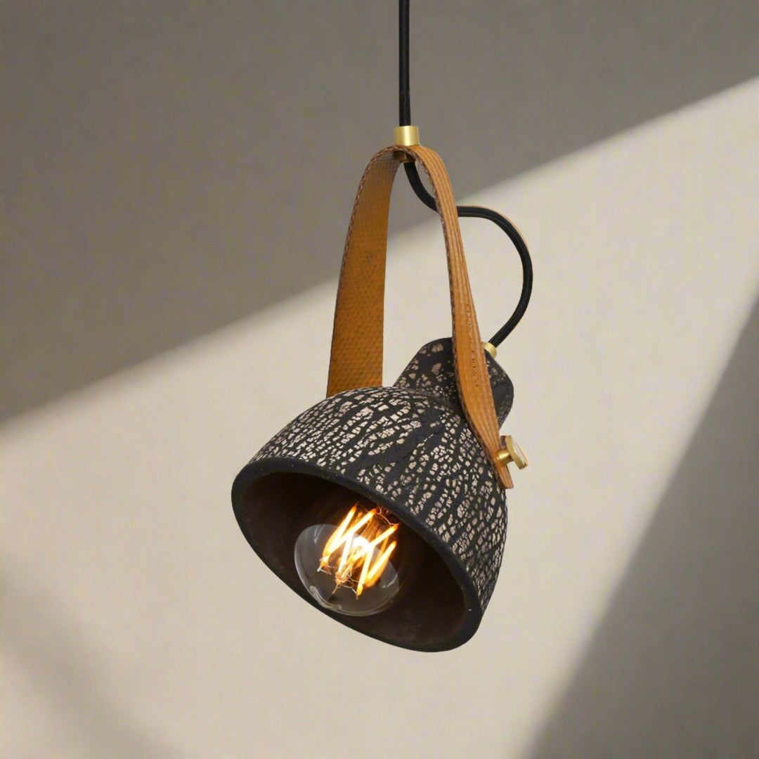 The Black Clay colour finish strongly showcases the crackled markings of the ceramic shade that is hand-crafted in Mullan Lightings ceramic studio in Mullan Village. The yellow rescued fire hose strap completes it beautifully.