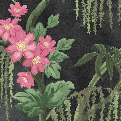 Delicately trailing branches adorned with vibrant blooms are set against a rich, black background. The contrast is simply mesmerizing and creates a sense of depth and drama on your walls.