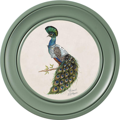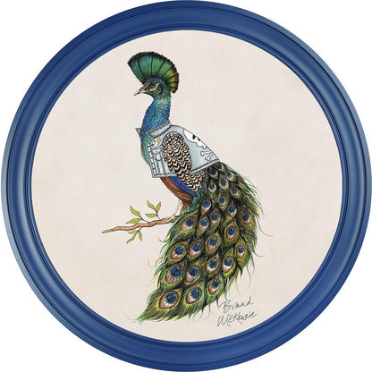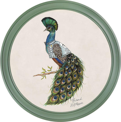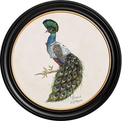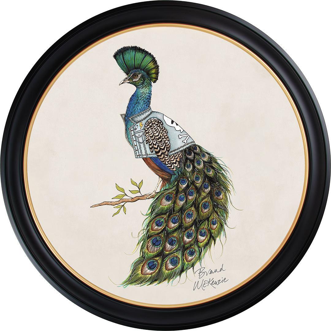 Make a bold statement with the "Punk Rocks - Prince" framed art print by Brand McKenzie. This striking peacock embodies rebellious style with his mohawk-style crest and a custom denim jacket featuring lightning bolts, skulls, and studs. His iridescent plumage shimmers in vibrant greens and blues, demanding attention. Confident, bold, and unapologetically unique, Prince brings an untamed yet effortlessly cool spirit to any wall.