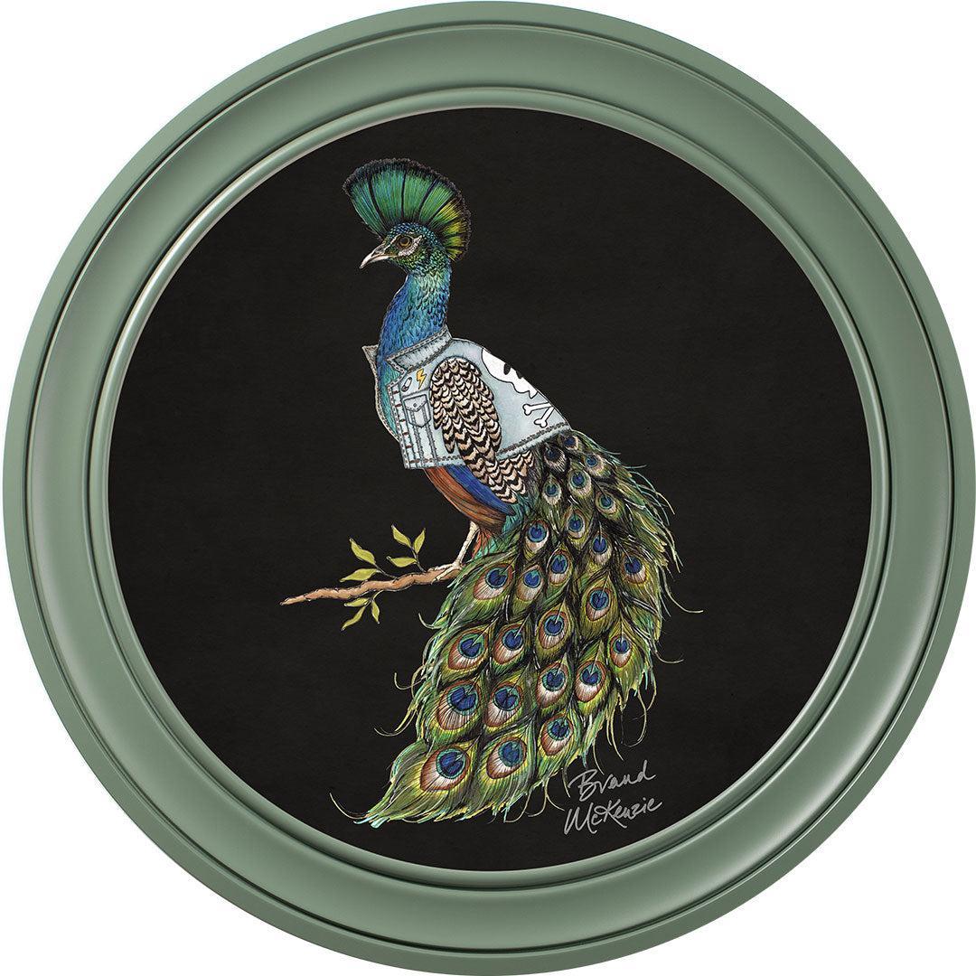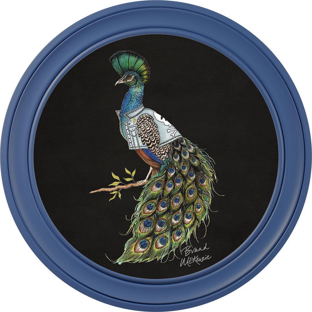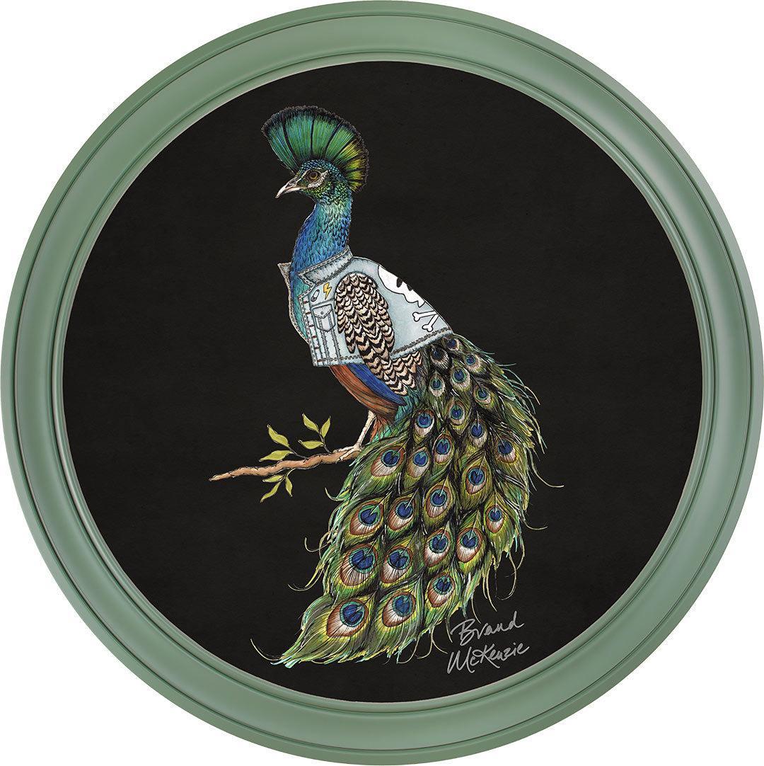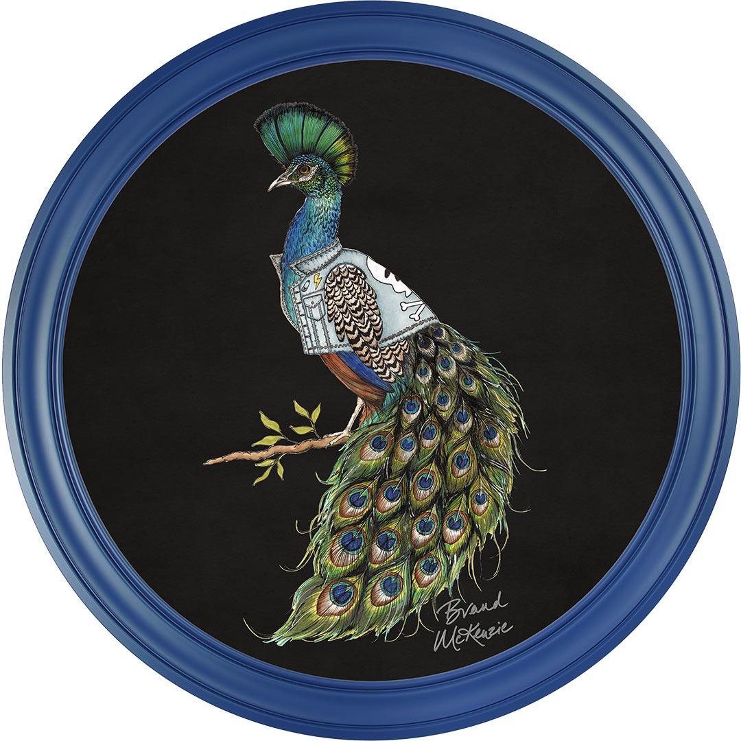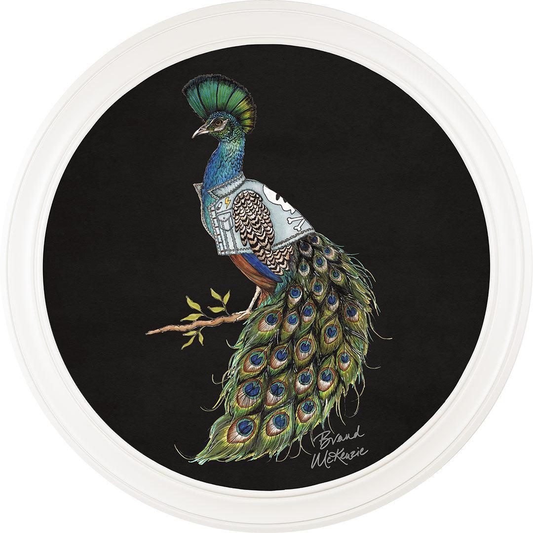 Make a bold statement with the "Punk Rocks - Prince" framed art print by Brand McKenzie. This striking peacock embodies rebellious style with his mohawk-style crest and a custom denim jacket featuring lightning bolts, skulls, and studs. His iridescent plumage shimmers in vibrant greens and blues, demanding attention. Confident, bold, and unapologetically unique, Prince brings an untamed yet effortlessly cool spirit to any wall.