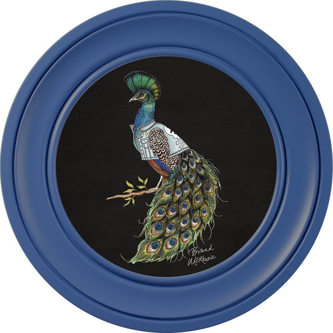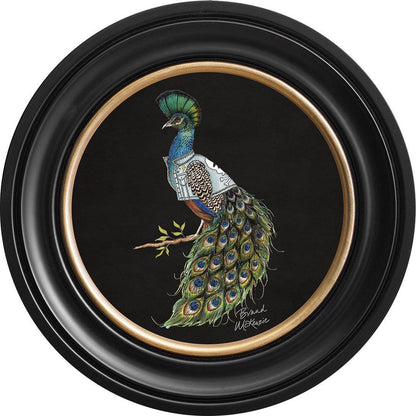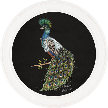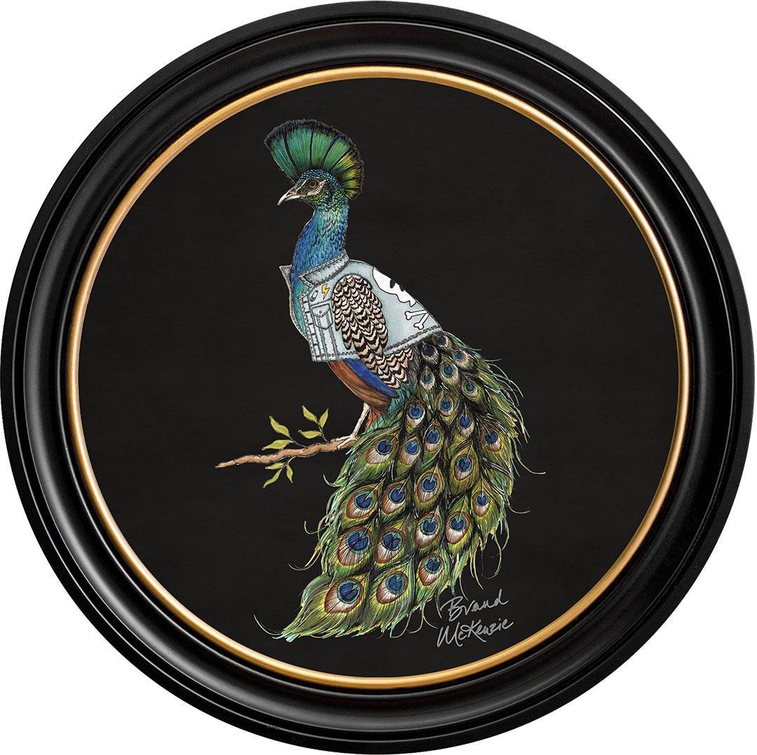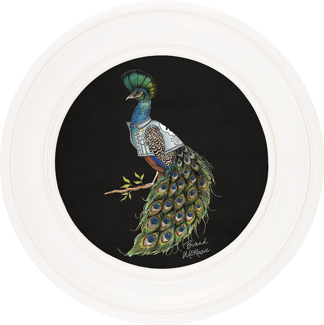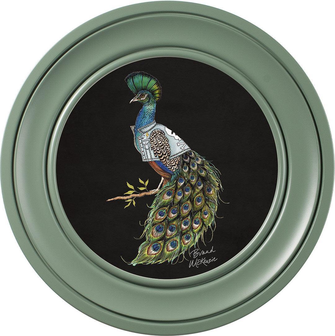 Make a bold statement with the "Punk Rocks - Prince" framed art print by Brand McKenzie. This striking peacock embodies rebellious style with his mohawk-style crest and a custom denim jacket featuring lightning bolts, skulls, and studs. His iridescent plumage shimmers in vibrant greens and blues, demanding attention. Confident, bold, and unapologetically unique, Prince brings an untamed yet effortlessly cool spirit to any wall.
