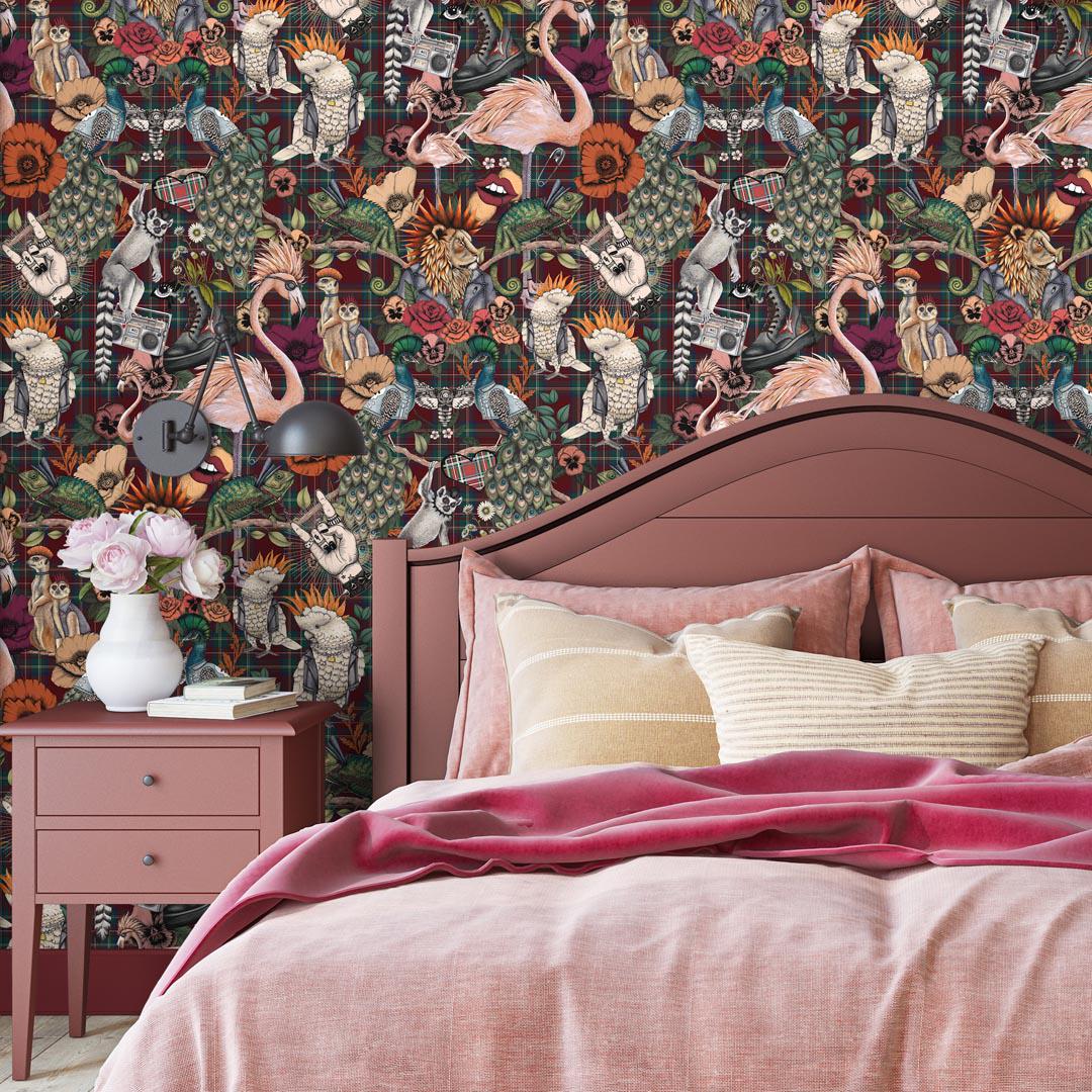 If you're seeking to infuse your space with a dash of defiant flair, the Punk Rocks Wallpaper in Wine from Brand McKenzie's Wild Life collection is a perfect choice. This striking and lively wallpaper is designed for the bold. It challenges norms and wholeheartedly embraces the unabashed essence of punk culture.