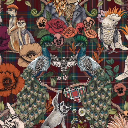 The wallpaper features a deep wine red tartan backdrop that captures the eye instantly. A closer look reveals a diverse array of creatures, each decked out in punk-inspired attire. These animals represent the core of punk ethos and fashion, complete with leather jackets, vibrant mohawks, and bold accessories.