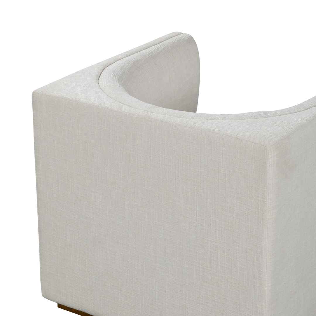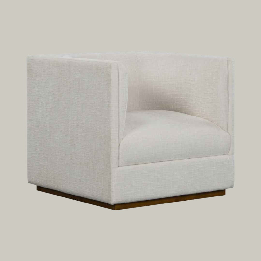 But the beauty of the Richlin Armchair doesn't end there. Its rich brown square base adds a touch of warmth and grounding to the overall design. It beautifully contrasts with the upholstery, creating a harmonious balance that is both visually striking and inviting. This chair is more than just a place to sit — it's a statement piece that elevates your entire living space. Available in both cream crosshatch or straw chenille.