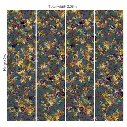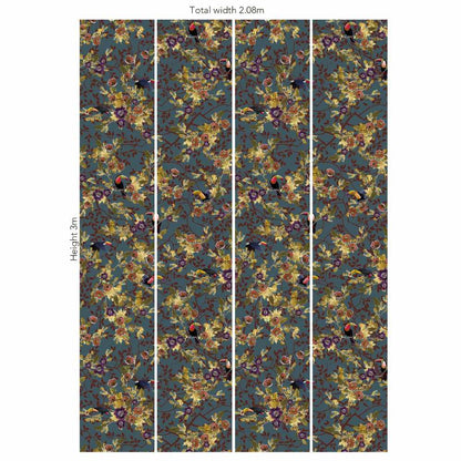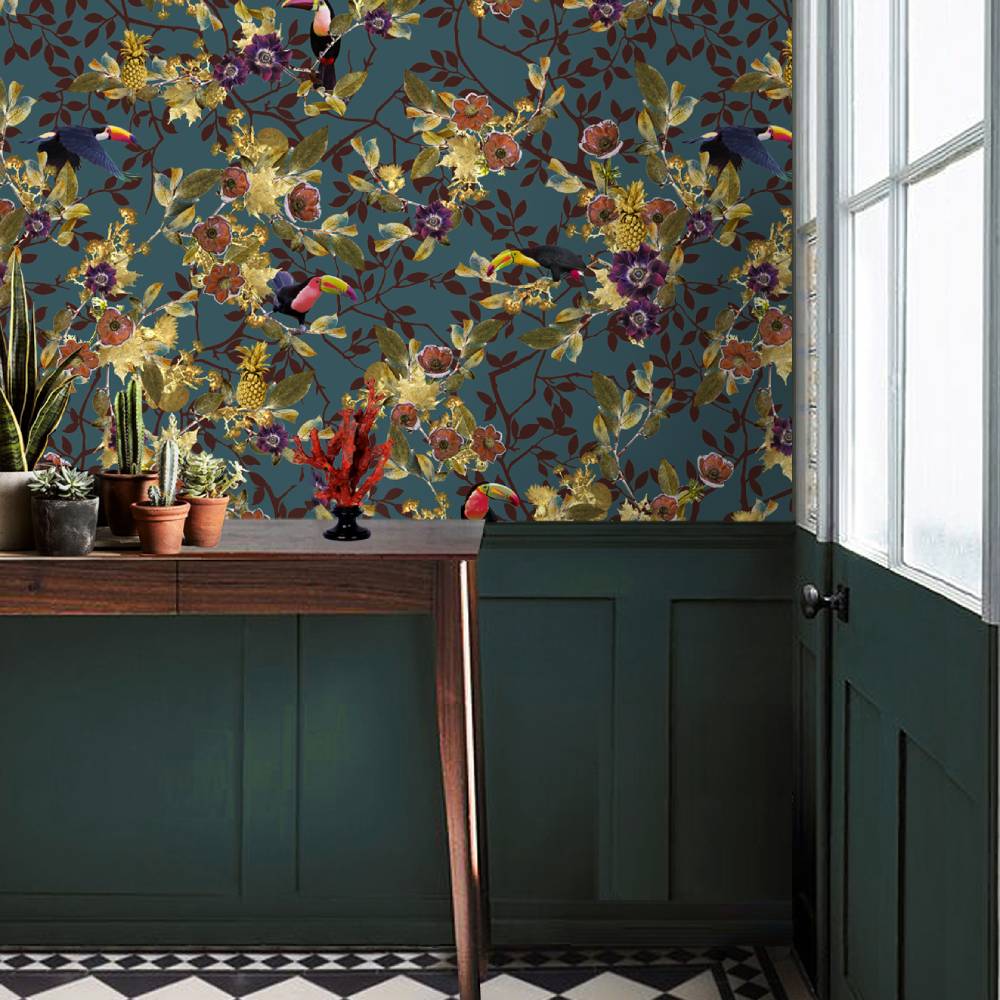 The intricate detail on this designer wallcovering is truly stunning. A colourful blend of gold, mustard, purple, ivory, black and pink stand out beautifully from the Laguna blue backdrop.