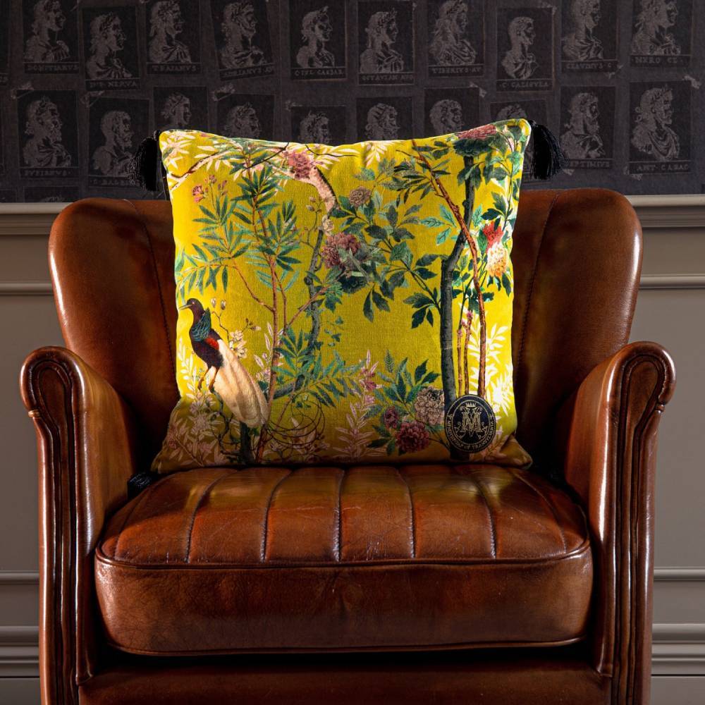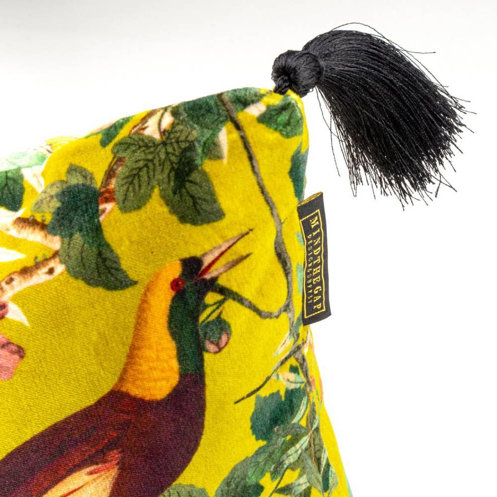 Our beautiful Royal Garden Velvet Cushion by designer MINDTHEGAP is sure to add a real luxury feel to your sofa or armchair. It features a rich botanical pattern with stunning birds of Paradise among the blooming branches. The vibrant green hues will bring a pop of colour to your room. This stylish cushion is finished off with black coloured tassels on the corners.