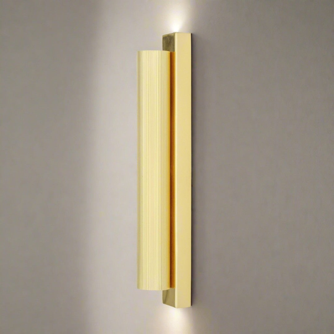 The glamorous Royce wall light by Mullan Lighting is a minimalist light fitting constructed from a single 50mm reeded brass tube fixed to a rectangular brass wall bracket.