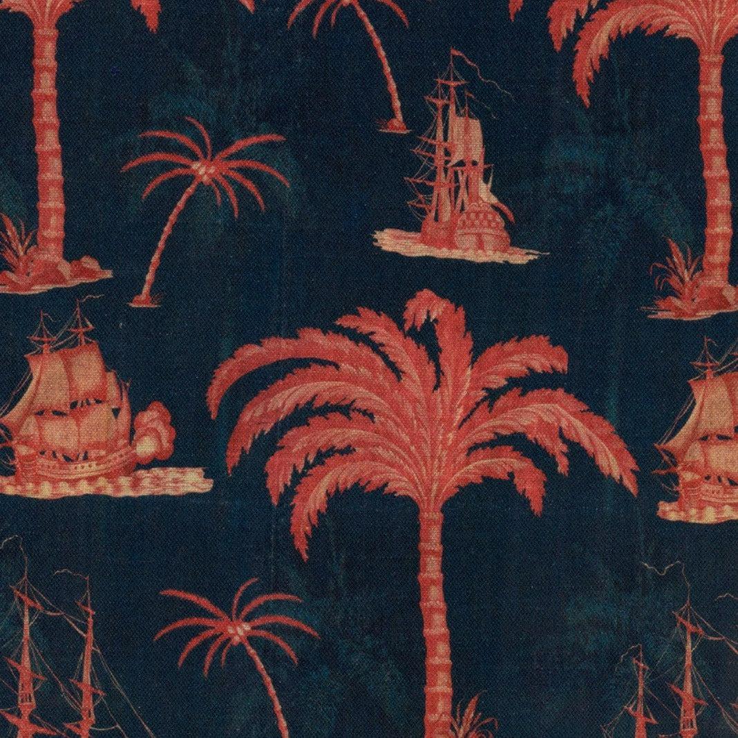 This large ottoman is upholstered in Aegean indigo fabric that displays wonderful island-life details, all oozing calm holiday vibes. Having a fine texture given by the linen fibres against an indigo background, palm trees are traced in shades of lobster red, highlighting the vibes of a summer night.