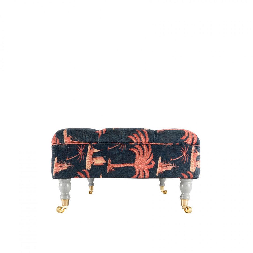 Perfect to use as a bench, footstool or improvised coffee table, this stylish Saray ottoman by Mind The Gap is upholstered in Aegean Indigo Fabric. This large ottoman bench has beautiful buttoned details, elegantly turned wooden legs with gold castors and distinctive brass rivets all around.
