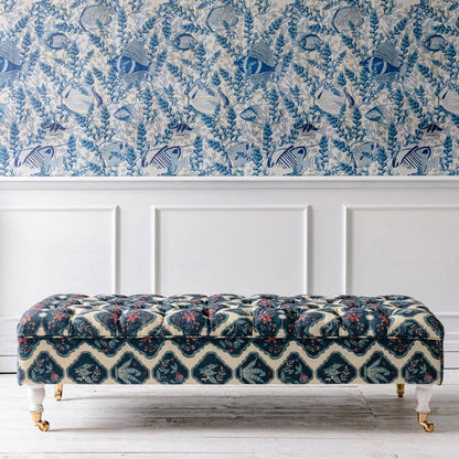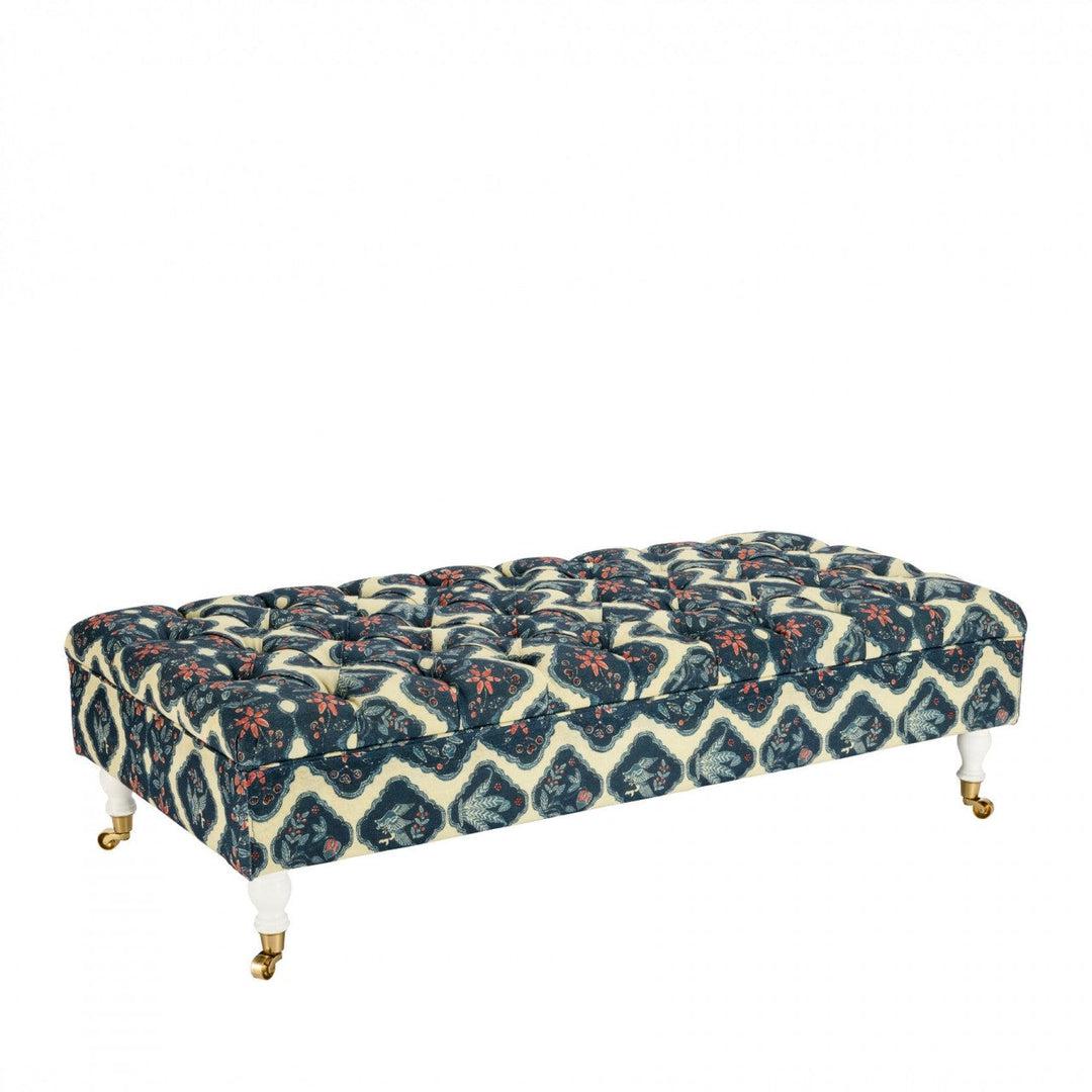 Perfect to use as a bench, footstool or improvised coffee table, this large Saray ottoman by Mind The Gap is upholstered in Phoenicia Batik Linen. This ottoman bench has beautiful buttoned details, elegantly turned wooden legs with gold castors and distinctive brass rivets all around.