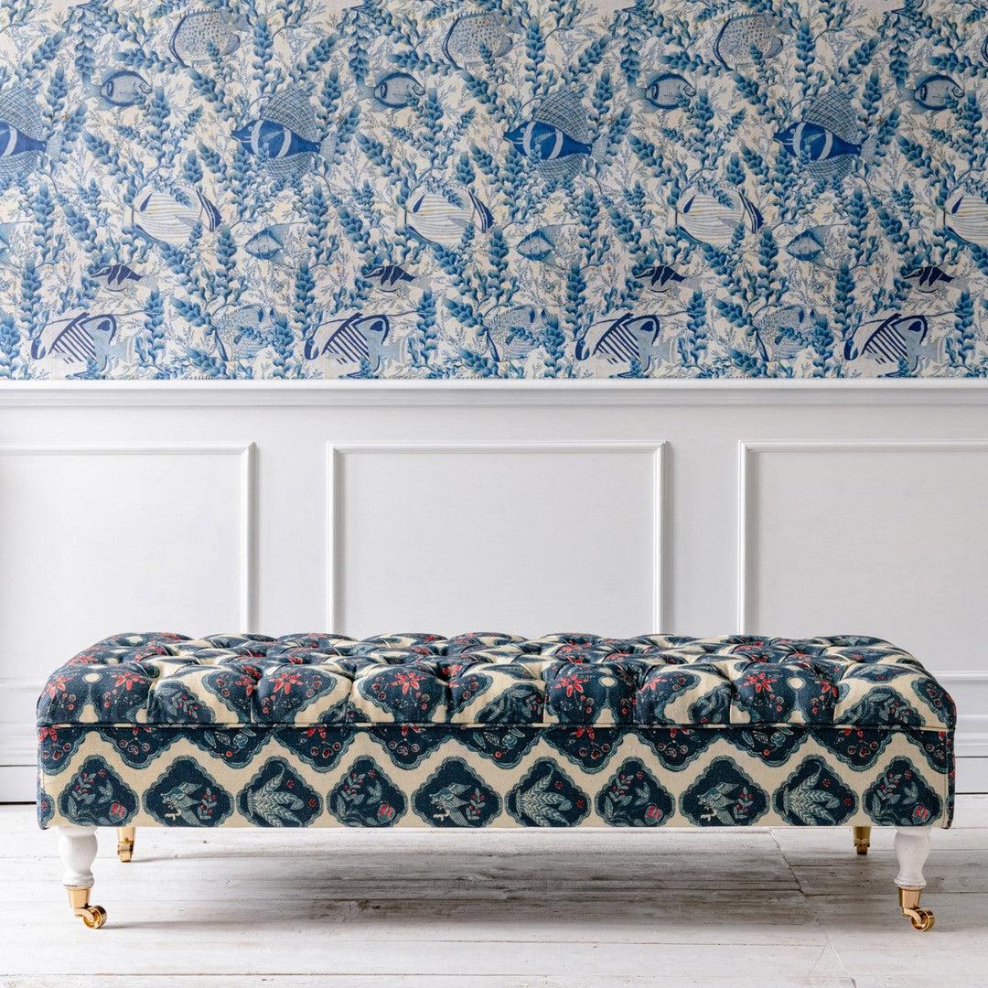 This large ottoman is upholstered in Phoenicia Batik Linen which has a mesmerising symmetry of shapes and colours and is in complete harmony with the Mediterranean spirit. Noble shades of deep blue and dark red emerge from the beautiful ornamental pattern revived from the sun burnt ancient earth.