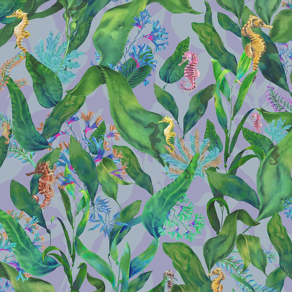 Seahorse Mangrove Wallpaper Spring Green by Brand McKenzie is a floral wall covering with a difference. Marvel at the seahorses as they explore the leaves or frolic in the shadows, with the bright and bold spring colours lighting up your feature wall, or bringing extra glimmers into your bathroom or kitchen area.