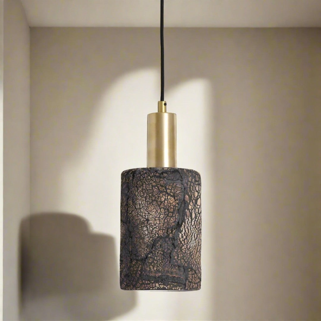 The Senna Organic Ceramic Cylinder Pendant Lamp has with its unique scorched markings is sure to create a stunning focal point. The rustic luxe charm come from the juxtaposition of coarse textured cracks that coat the exterior of this ceramic pendant and the sleek brass accents.