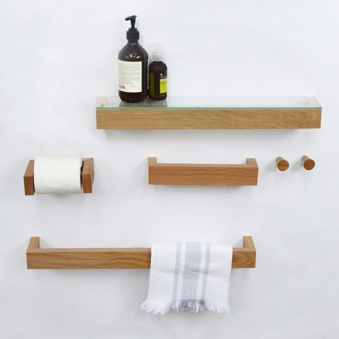 With its sleek, geometric rectangular form, the natural oak slimline glass shelf is the perfect contemporary storage solution for your bathroom. The simple 55cm wide wooden and glass shelf provides a stylish ledge for all your bathroom essentials whilst offering a sophisticated aesthetic that works wonderfully with other minimalist bathroom accessories.