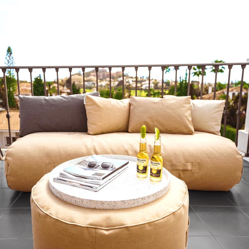 The Social outdoor seating set is the perfect lounge set if you want to furnish your terrace or patio in one easy step. It features a daybed with cushions, two lounge satellite chairs a pouffe and terrazzo tray top to create a flexible seating area with a Scandinavian style.