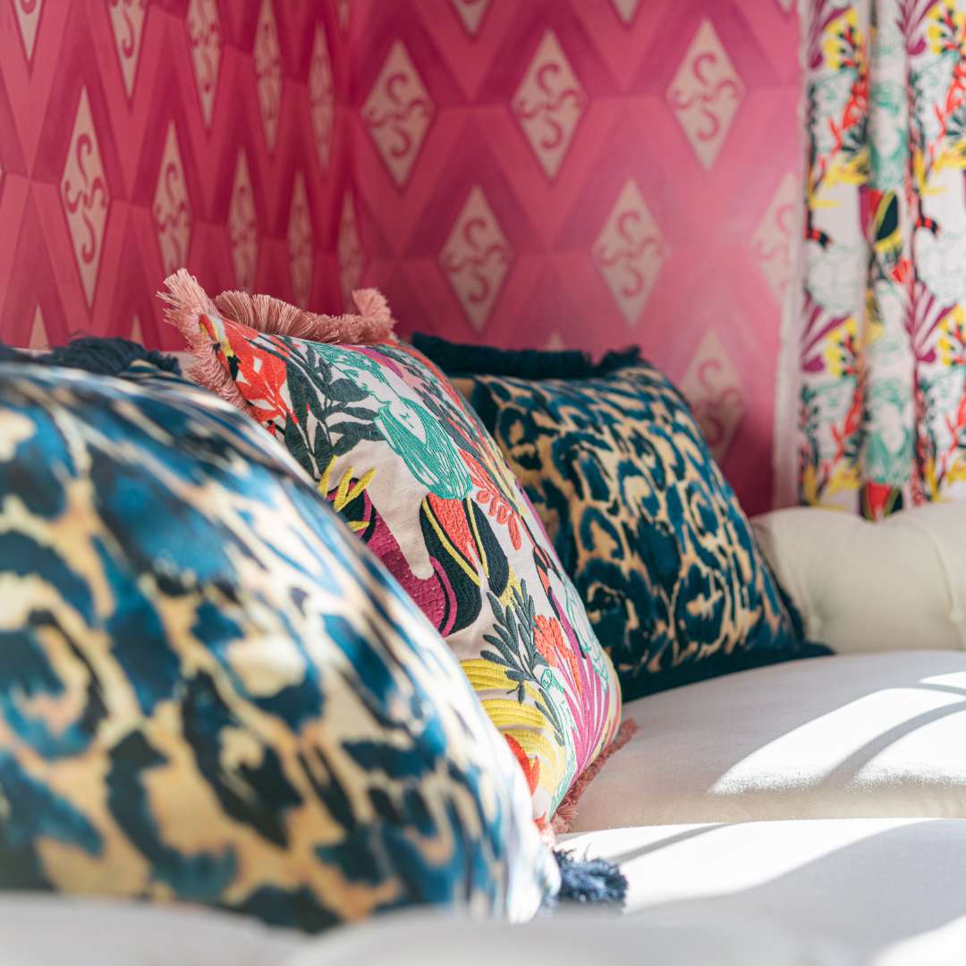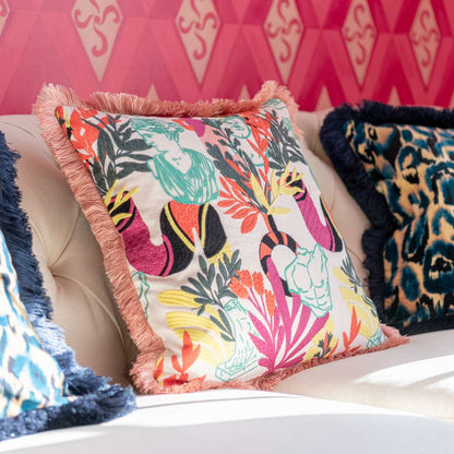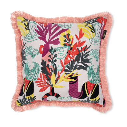 Set against a backdrop of clean lines and abstract shapes, the Statuario cushion by MINDTHEGAP brings intricate embroidered details to life, evoking the timeless elegance of classical artistry. This stunning design celebrates the balance of contrasts, where the crisp white of ancient statues is beautifully juxtaposed with the vibrant colours of delicate flowers, creating a striking and sophisticated visual. A thick pink fringe frames the cushion, adding a refined finishing touch. Elevate your space with the perfect blend of old-world charm and modern design, crafting an atmosphere that feels both harmonious and serene.