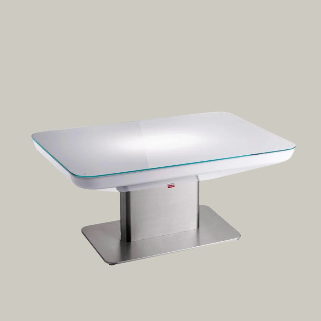 The Studio table consists of a wing-like tabletop with rounded corners and a central column in brushed stainless steel. The high gloss coated ABS table is finished with a glass top to protect it. Choose from white light or multicoloured LED light table with power cables or a rechargeable multicoloured LED table with up to 10 hours of use from one charge.