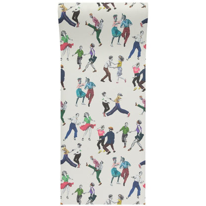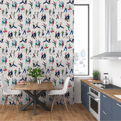 A vibrant conversational design, featuring beautiful hand drawn illustrations by Amy Hood. Inspired by vintage Lindy Hop dancers and set on a natural cream background, this wallpaper is sure to make a statement in any interior!