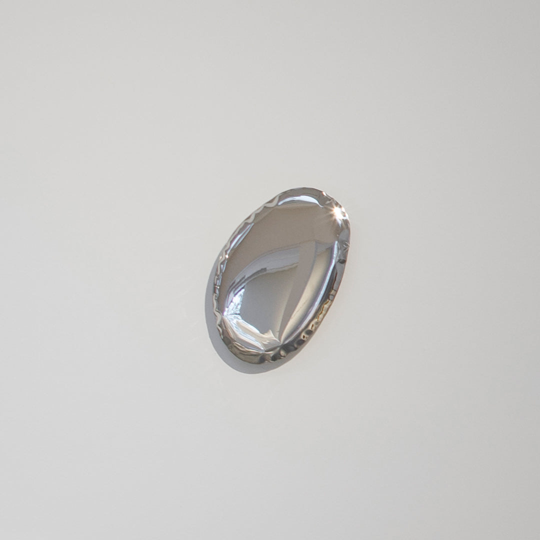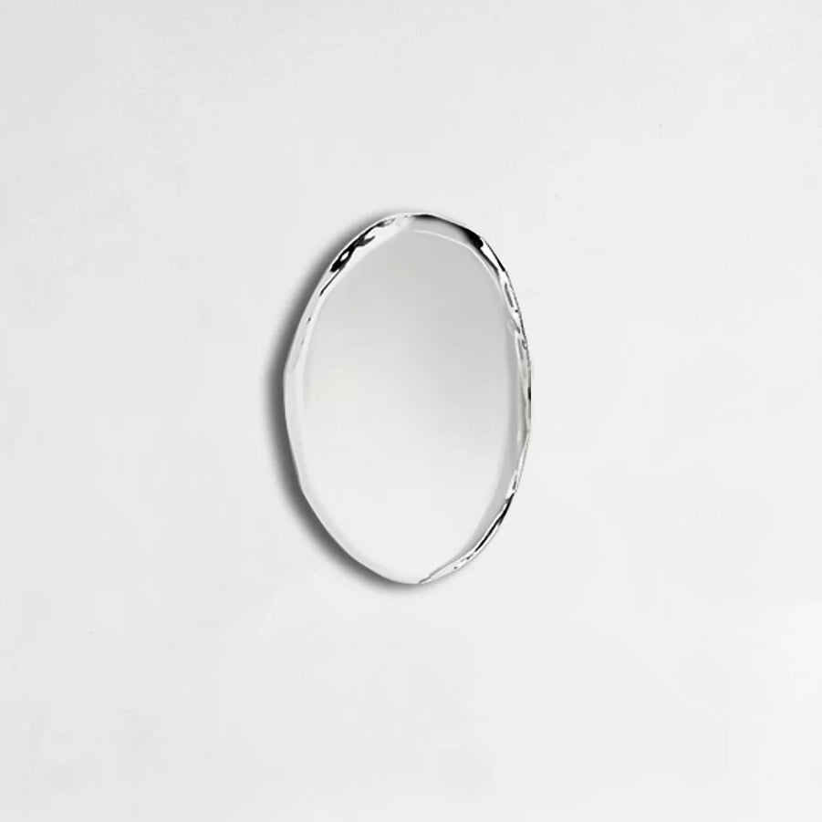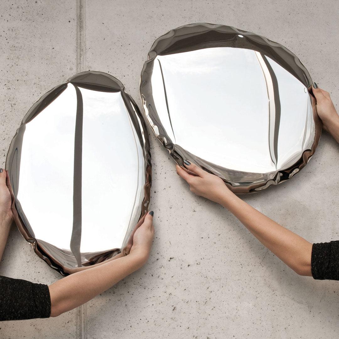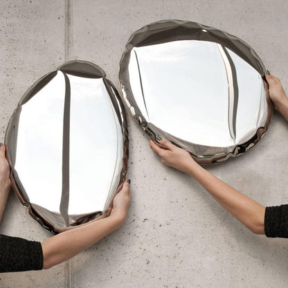 Introducing the Tafla O5 Mirror from world-renowned designer, Oskar Zieta. This unique steel mirror is a stunning example of modern art that will elevate any room's atmosphere. Created using FiDU technology, the mirrored surface is made of inflated metal for an eye-catching structure that provides not only just a reflection but another dimension of space on your wall. The polished inox lends a modern and sophisticated look to the mirror so it stands out no matter what your style.
