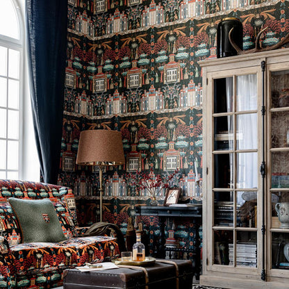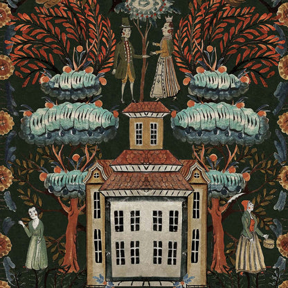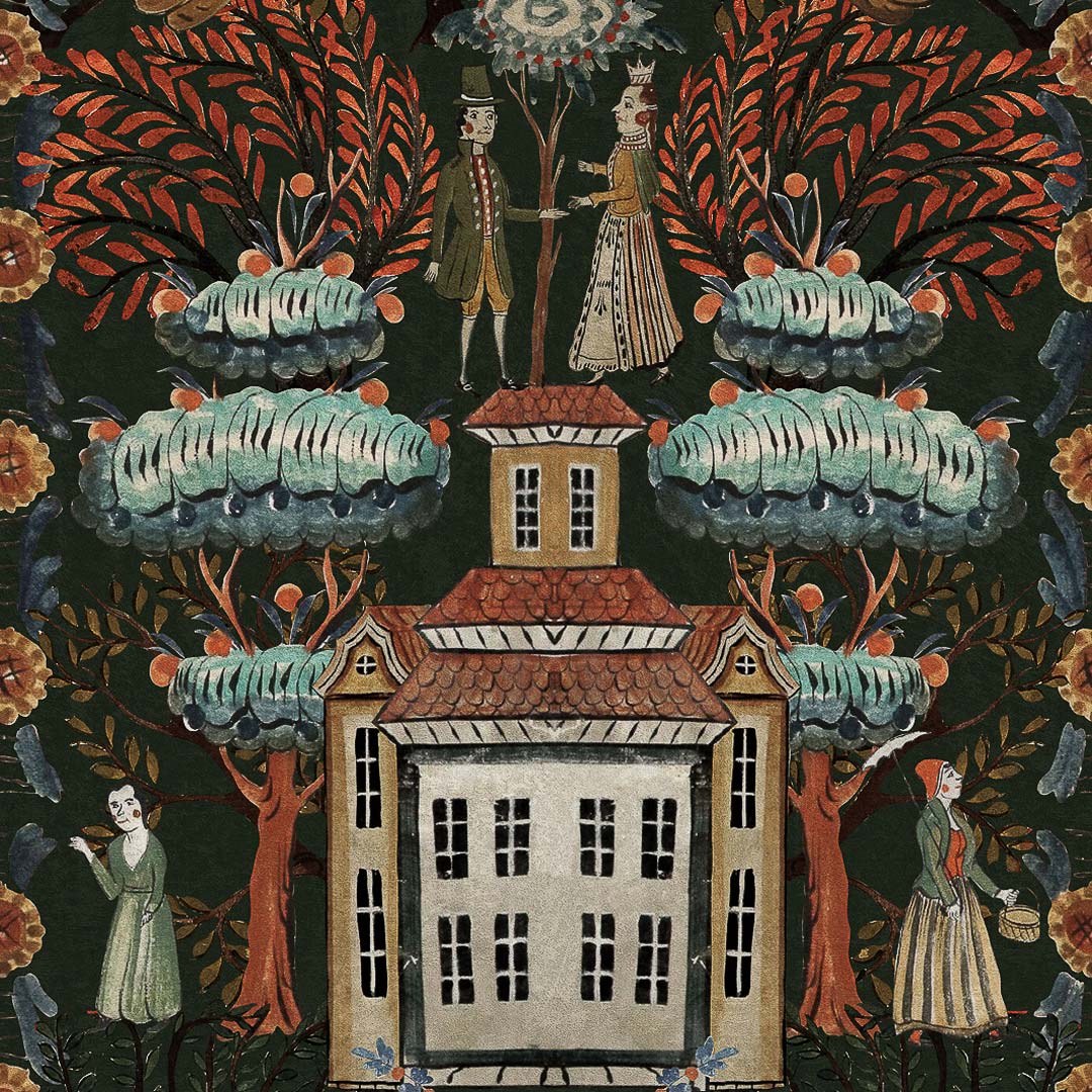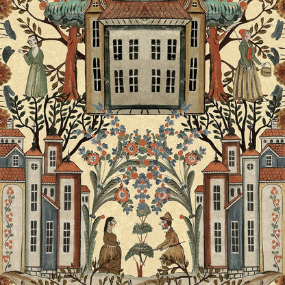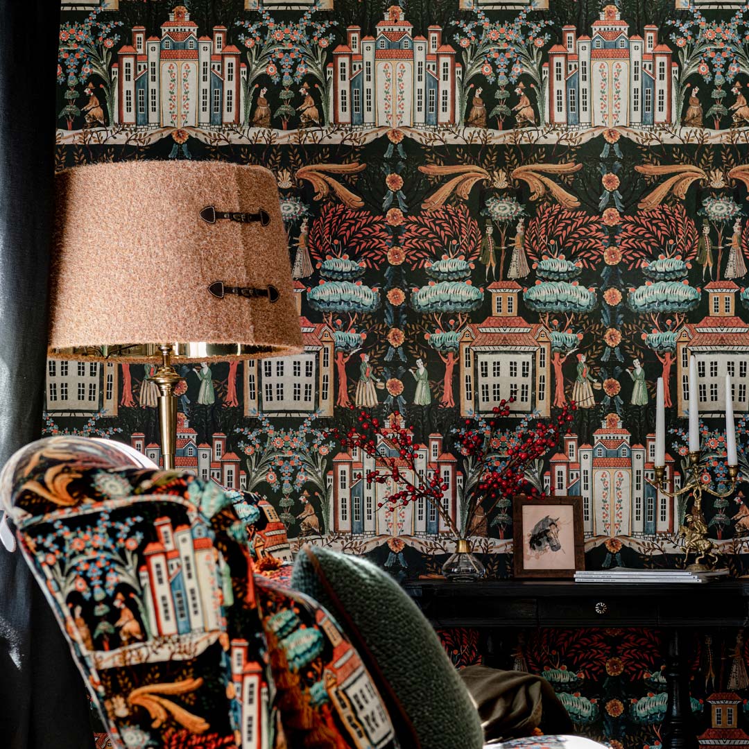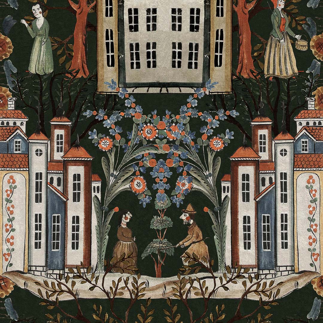 The wallpaper is a magical design and the intricate detailing of the buildings and people in this design is what makes it so special. You can almost imagine yourself walking through a charming Tyrolean village when you look at it. Rosy-cheeked in their traditional costumes, these charming characters inhabit an imaginary town surrounded by trees and flowers in a host of jewel-like shades.