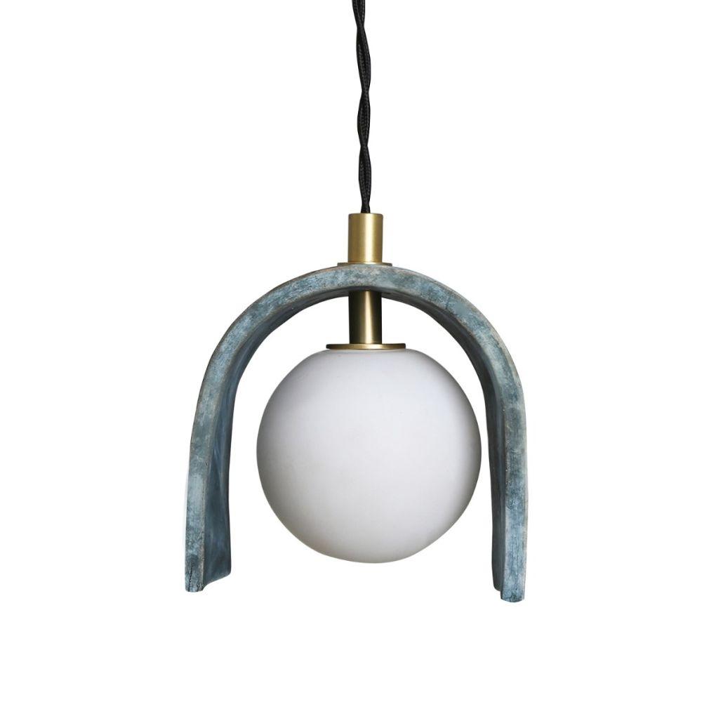 The Tansy Ceramic Pendant in a mesmerising Blue earth colour supports a white opal glass globe shade which diffuses a soft glow of light which emphasises the sleek brass fittings and twisted flex.