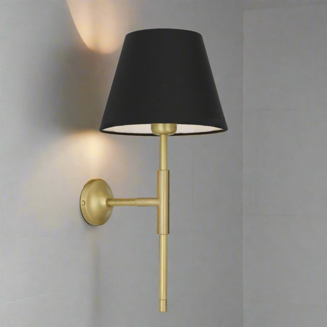 The elegant Tenby wall light with fabric shade by Mullan Lighting is a sophisticated light fitting with brass arm and choice of black or white fabric shade.