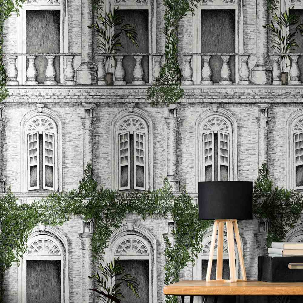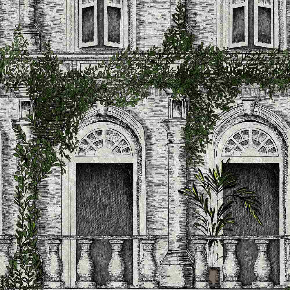 Designed by Brand Mckenzie, The Architecture Wallpaper is an amazing hand sketched drawing demonstrating beautifully intricate detail surrounding the doors and the windows of this architectural building. Creeping green foliage adds to this unique and stunning design.