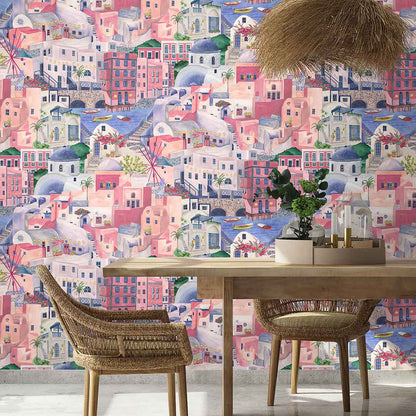 The Lavender Rose colourway gives this designer wallpaper a new outlook as if the sun is setting on the scene and casting its glow over the houses below. The bright yellows of the boats and lighting add to the early evening effect, making this paper great for a bedroom or a relaxing living setting. Add a holiday vibe to your home with this Brand Mckenzie wallpaper.