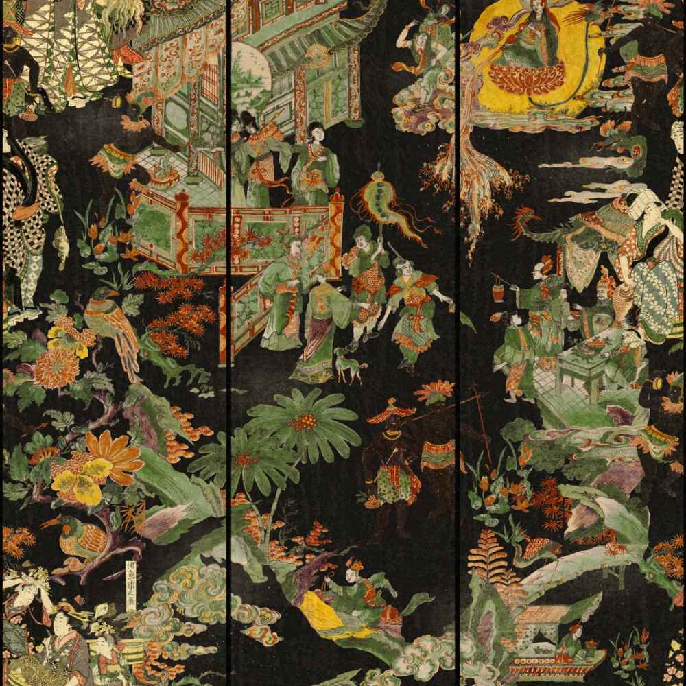 Intriguing and sophisticated, this Asian style wallpaper is inspired by ancient Chinese and Japanese folding panels. With large scale hand coloured illustrations, the wallpaper features different rituals and characters collected from ancient Japanese books.