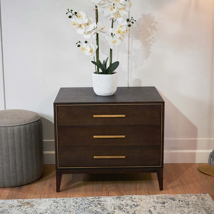 Are you looking for a stylish and functional side table to suit your home? Look no further than the Thomas 3 Drawer Side Table by RV Astley! This side table has been carefully handcrafted from a rich chocolate veneer and finished with luxurious brass trim, giving it an expensive and eye-catching look.